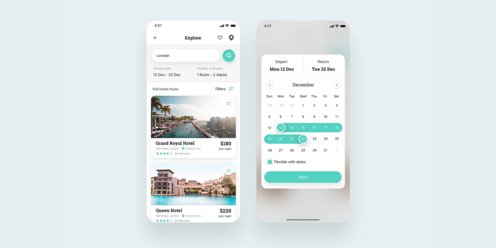 - Hotel Booking: Shows the list of hotels nearby with their ratings and other details, filter UI and custom calendar view etc. (Demo)