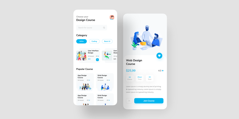 - Design Course: A minimal UI showing list of courses related to UI design. (Demo)